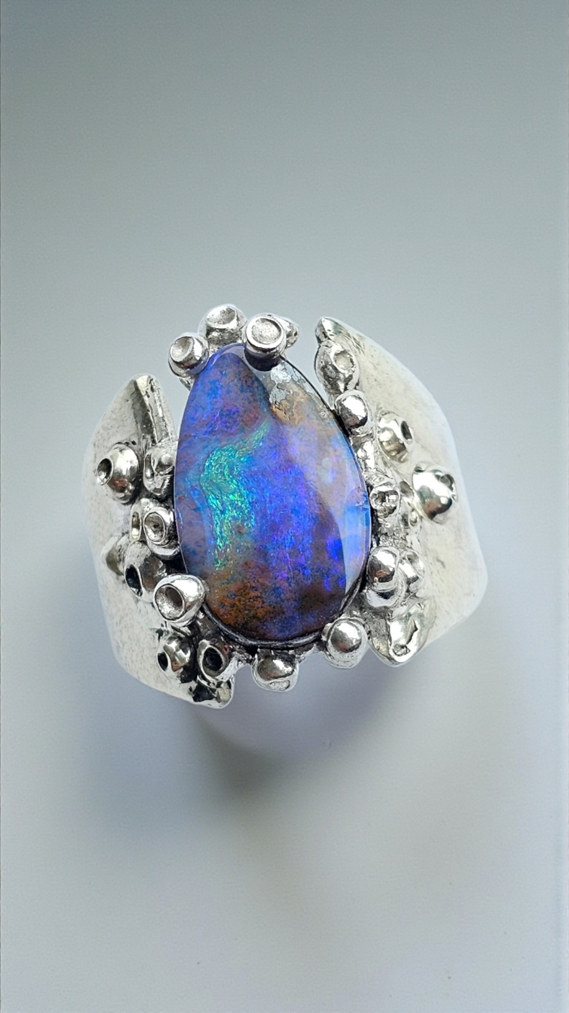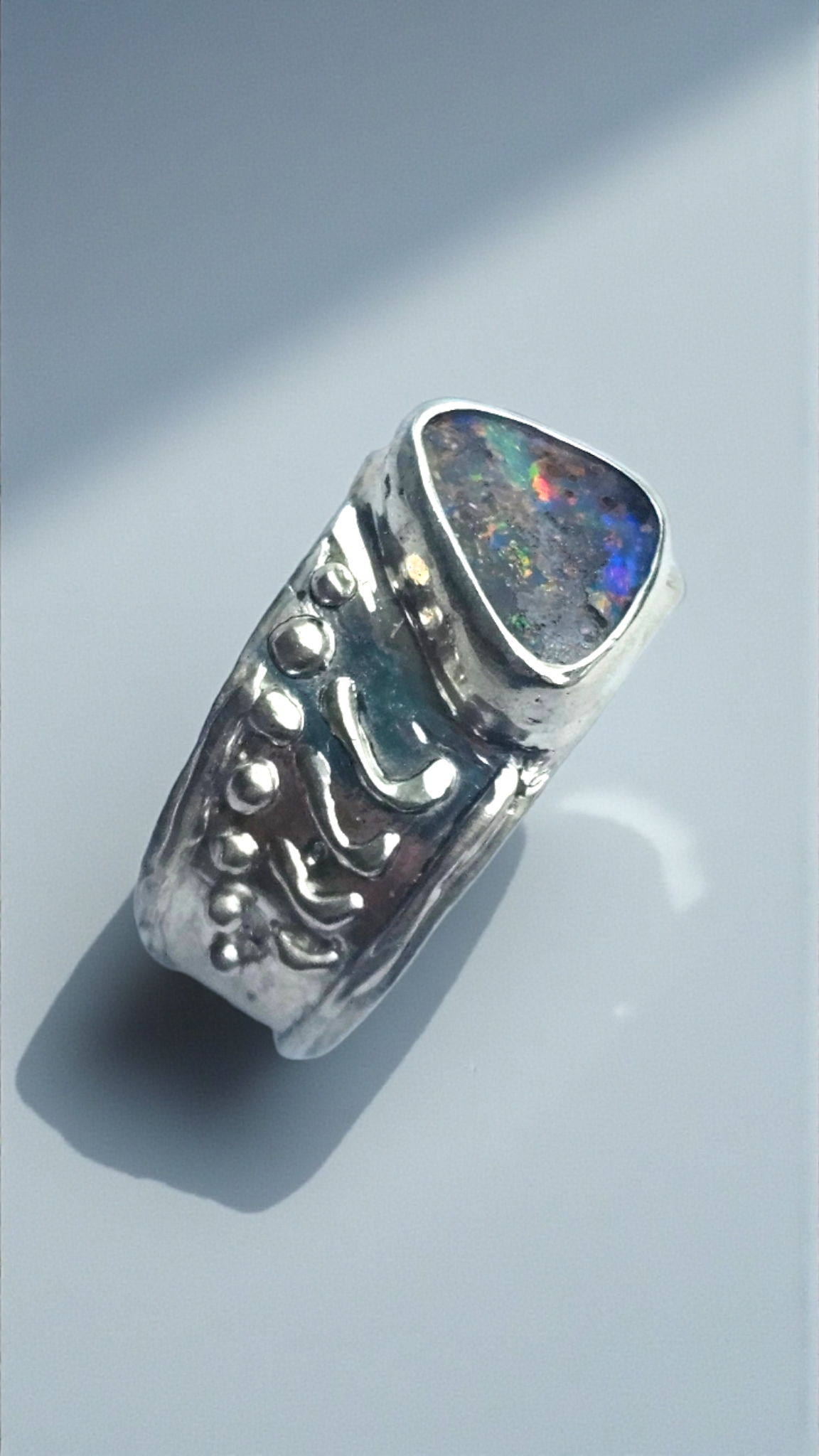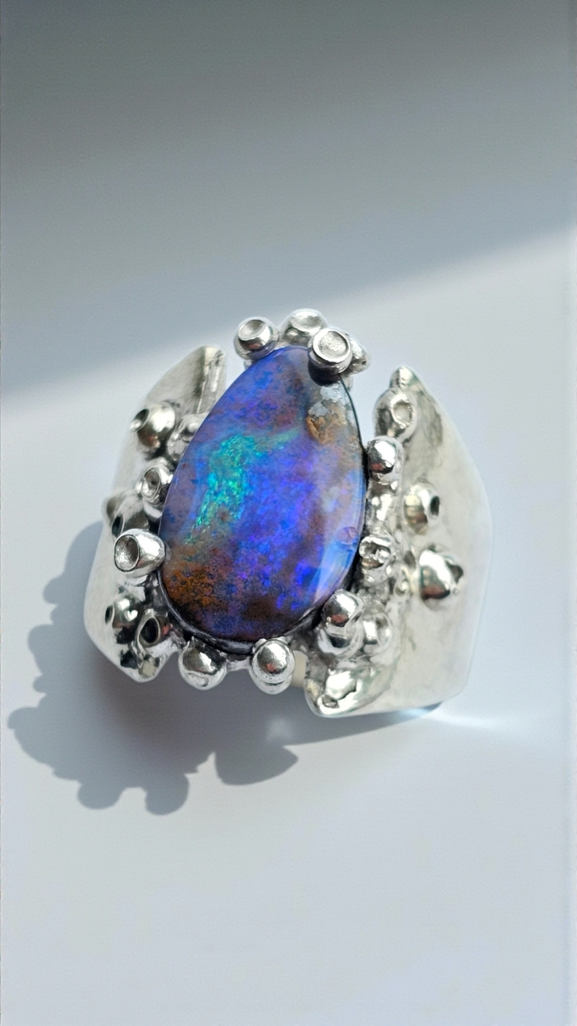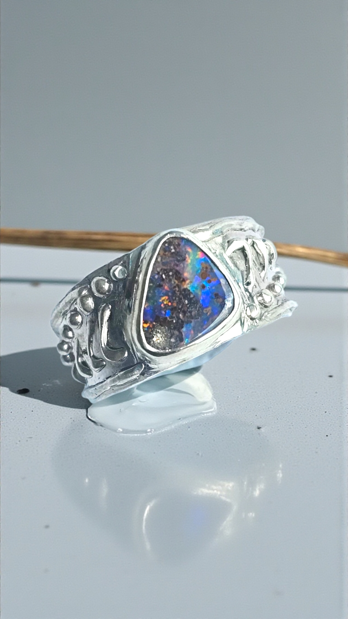“Cosmic Reef” – Triangular Boulder Opal Ring (9.25)