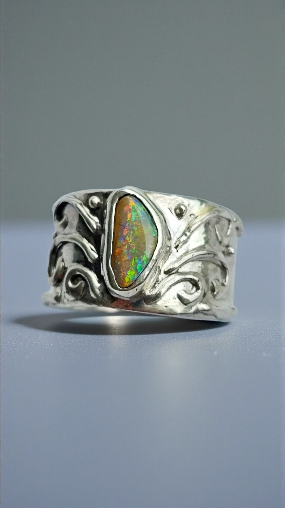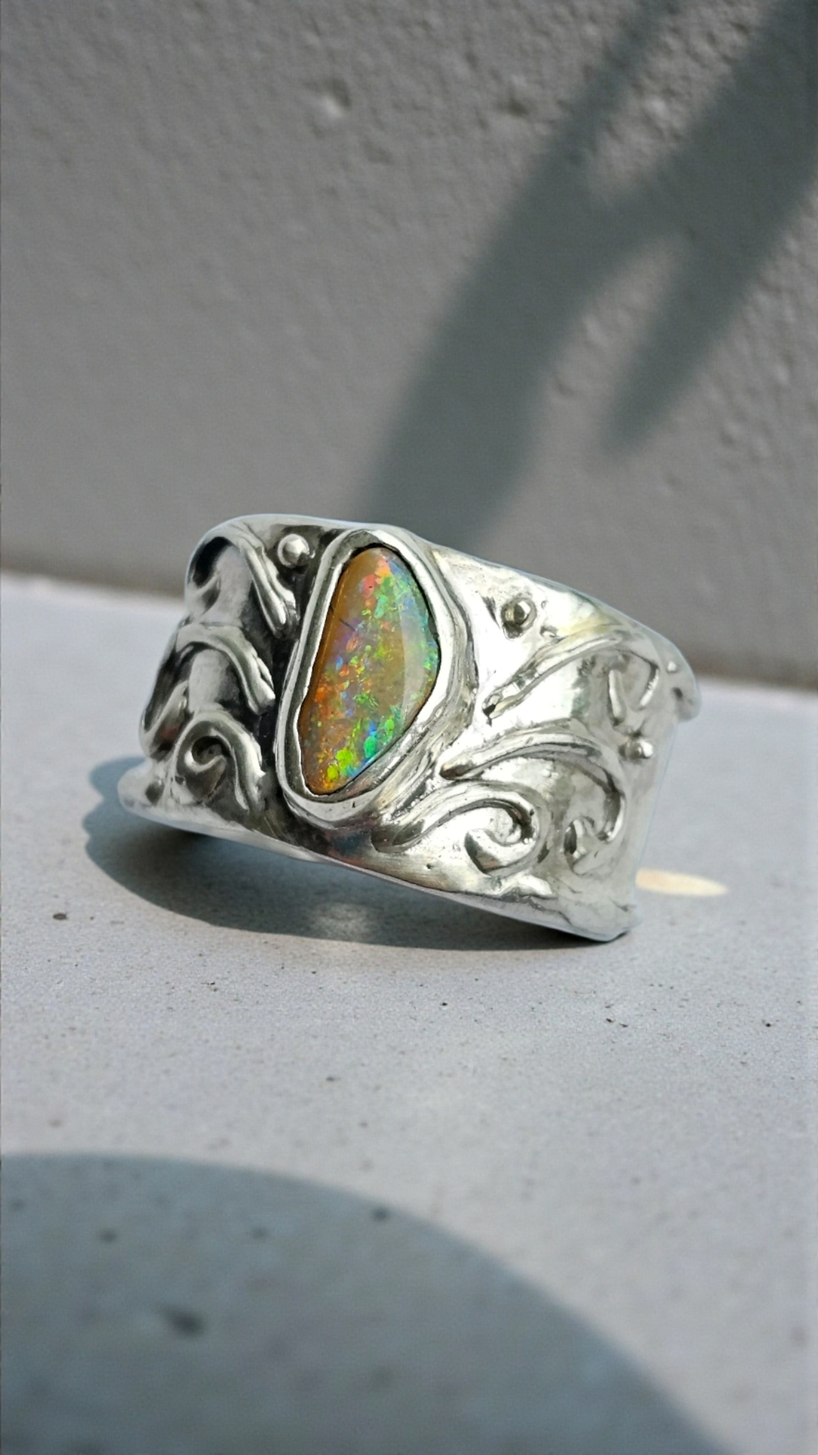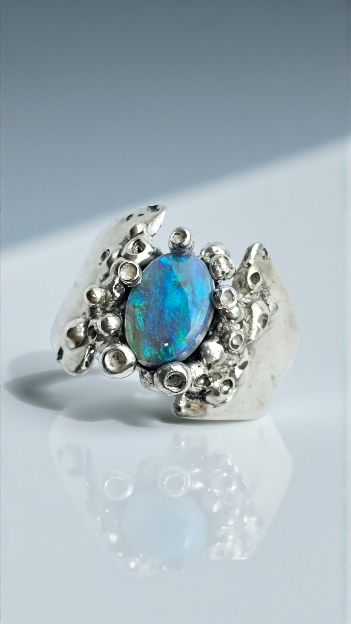 “Cosmic Reef” – Triangular Boulder Opal Ring (9.25)