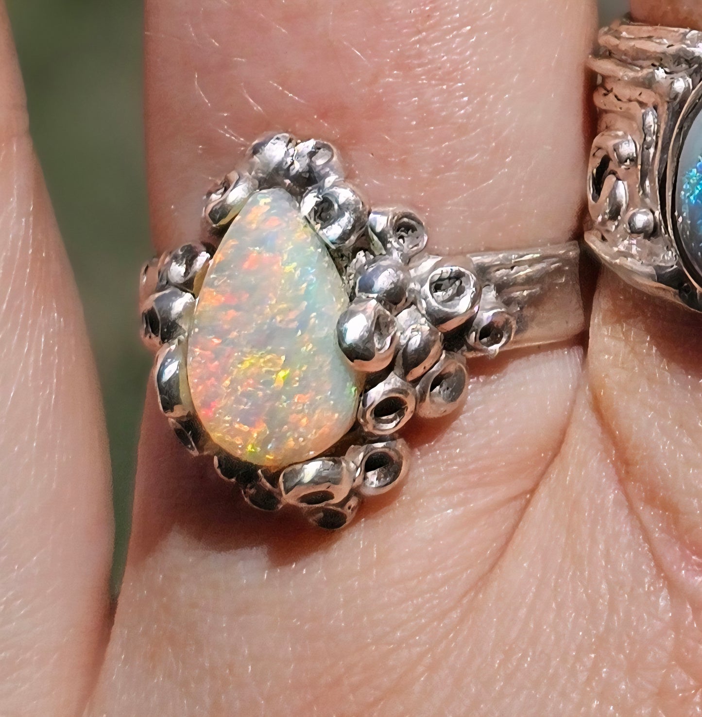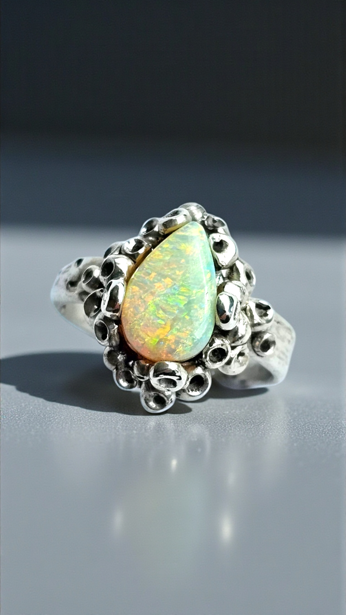 A milky opal drenched in fiery pastel colour — from seafoam mint to peach-sunset glow. This teardrop stone sits inside a crown of barnacles, like a treasure discovered in a hidden tide pool. Feminine, radiant, and regal in a raw, oceanic way.