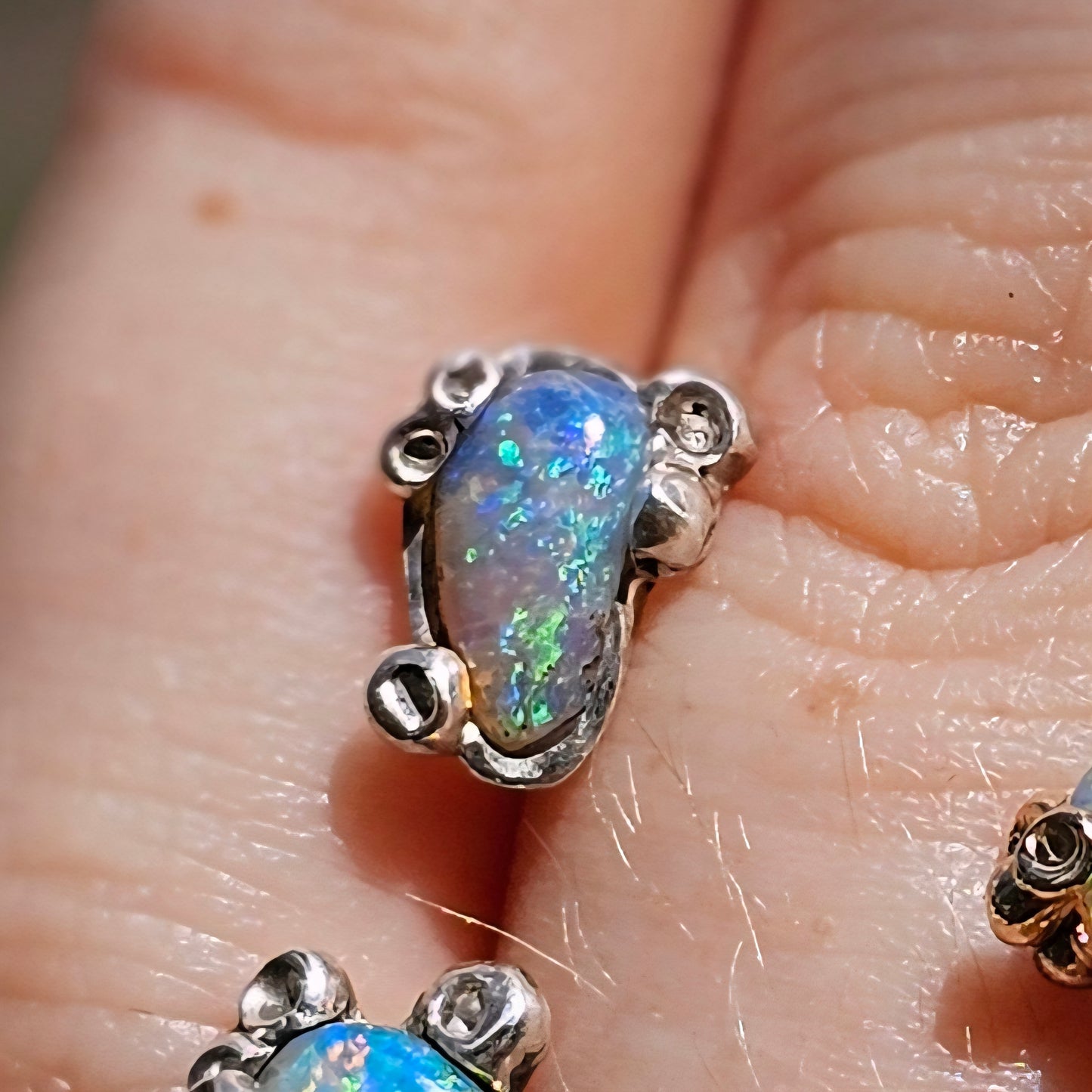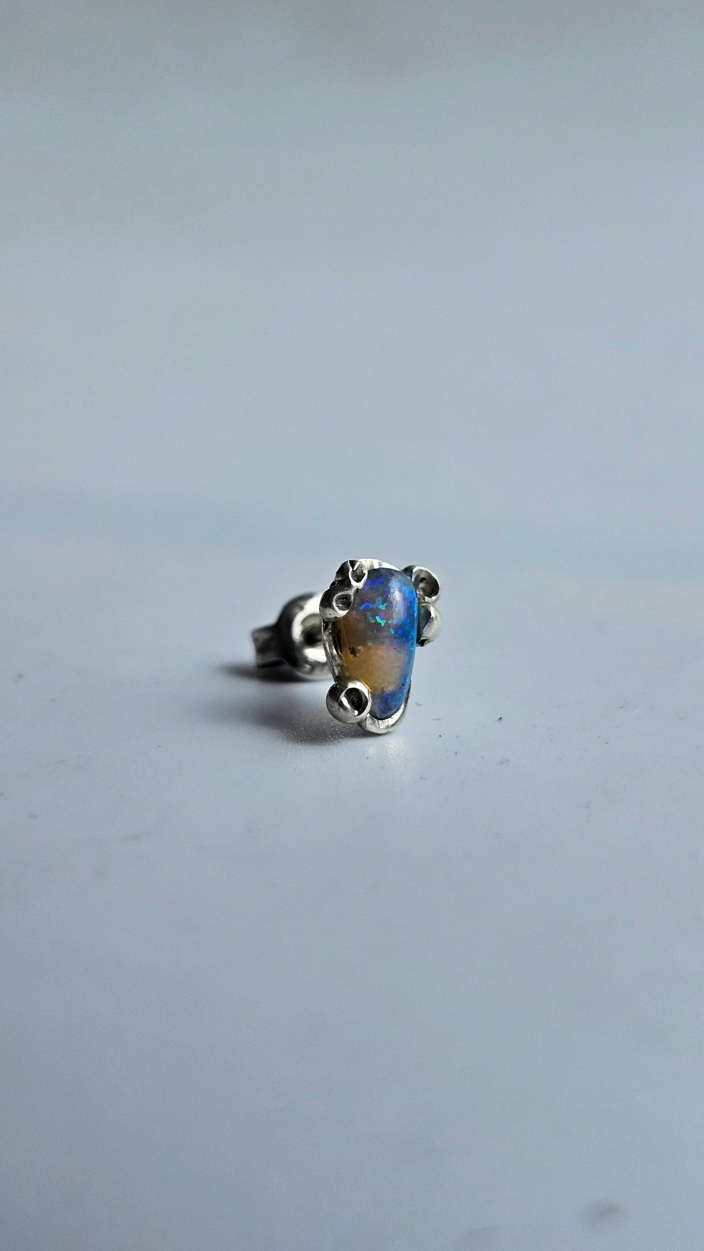 A tiny whisper of the sea, captured in silver. Echo Tide features a free-form opal with rippling turquoise, lime, and ocean-blue sparks, nestled beneath raw, hand-sculpted barnacle detailing. Each stud is a miniature tide pool—organic, textured, and completely one-of-a-kind.