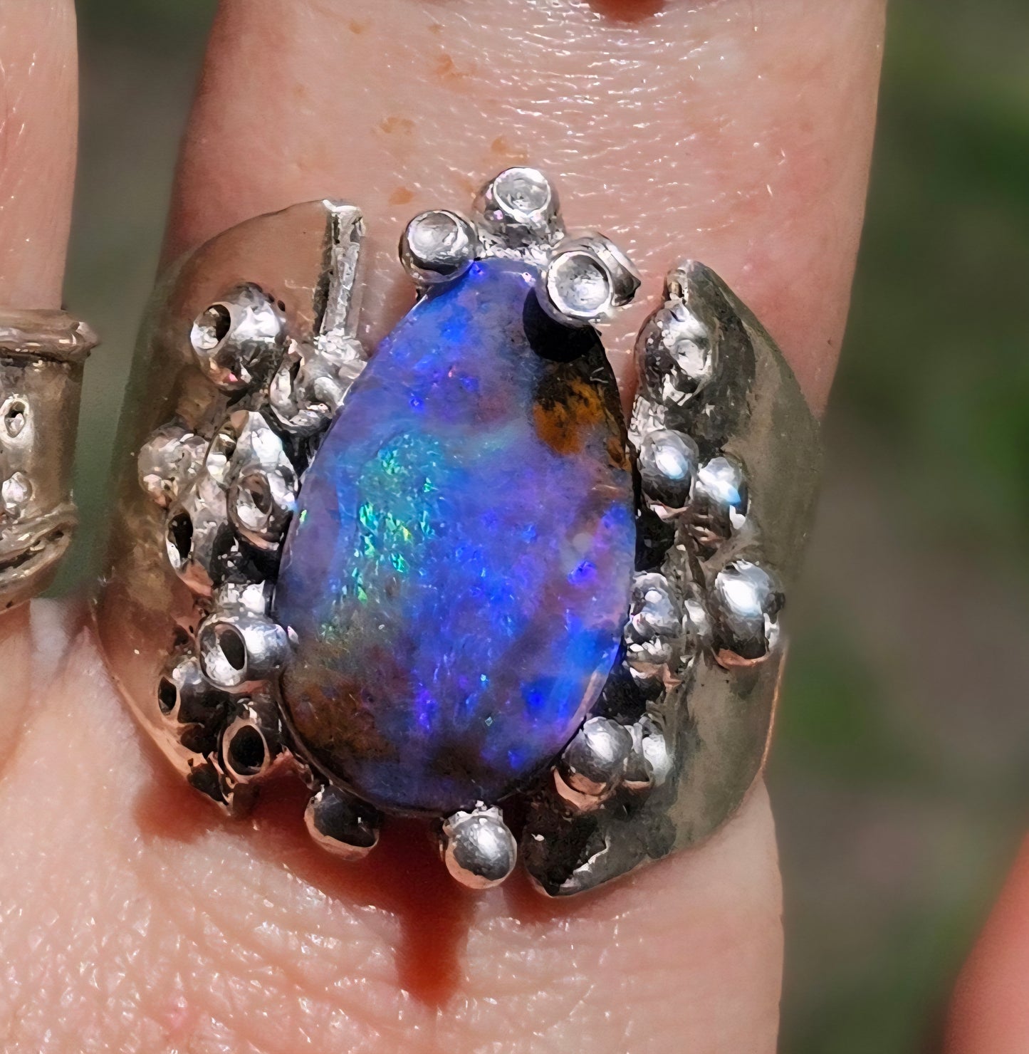 An opal that mirrors the deepest part of the sea — royal blue, streaked with cosmic violet. Surrounded by clustered barnacle silverwork, this piece appears as if it was pulled straight from a shipwreck treasure chest. Bold, moody, and unforgettable.