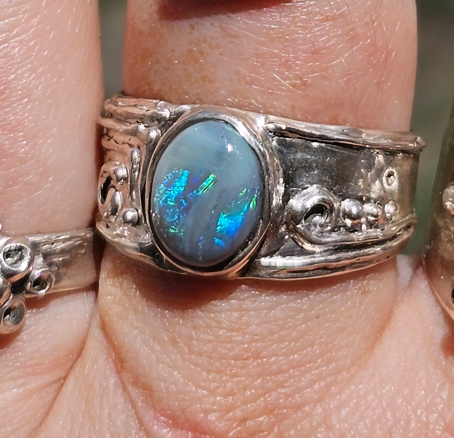 Like moonlight drifting across open water, this ethereal blue opal glows with misty, shifting colour. The bezel is framed with tidal textures, rippling down the band like tiny waves. Moonpool Drift is subtle yet powerful — perfect for everyday wear or paired in a bold ocean stack.
