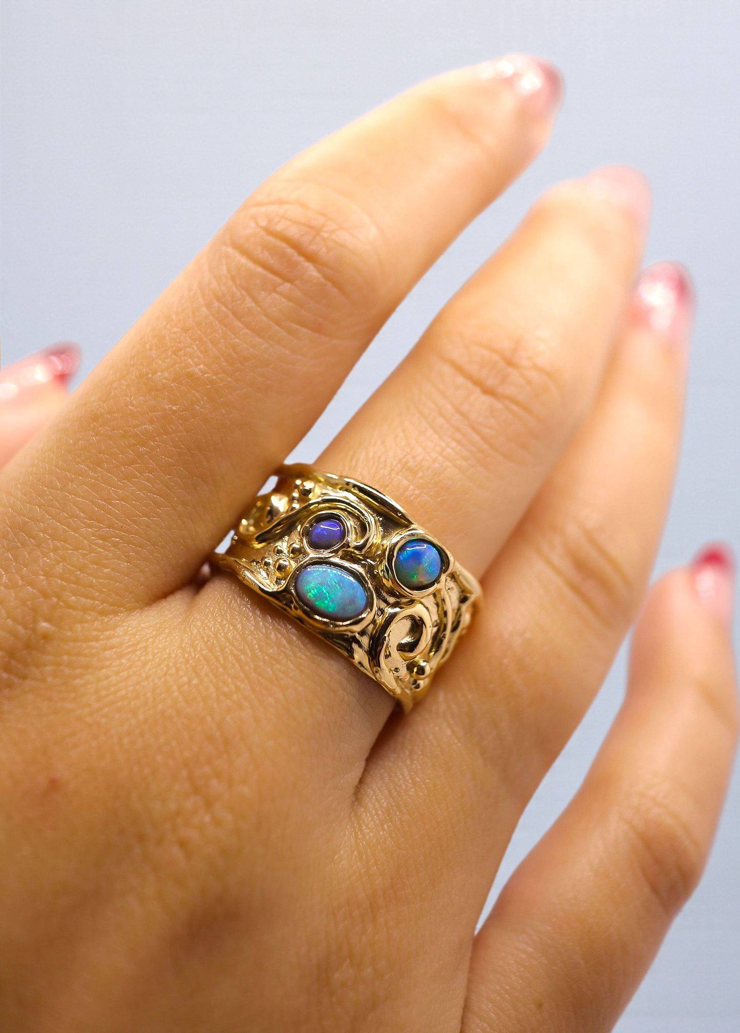 Forged in molten gold and shaped like a relic lifted from the sea floor, Oceanborn embodies the untamed heartbeat of the ocean. Three natural Australian opals sit at its crest, glowing like tidal pools struck by moonlight—each shifting with deep blues, sea-greens and iridescent galaxies.
