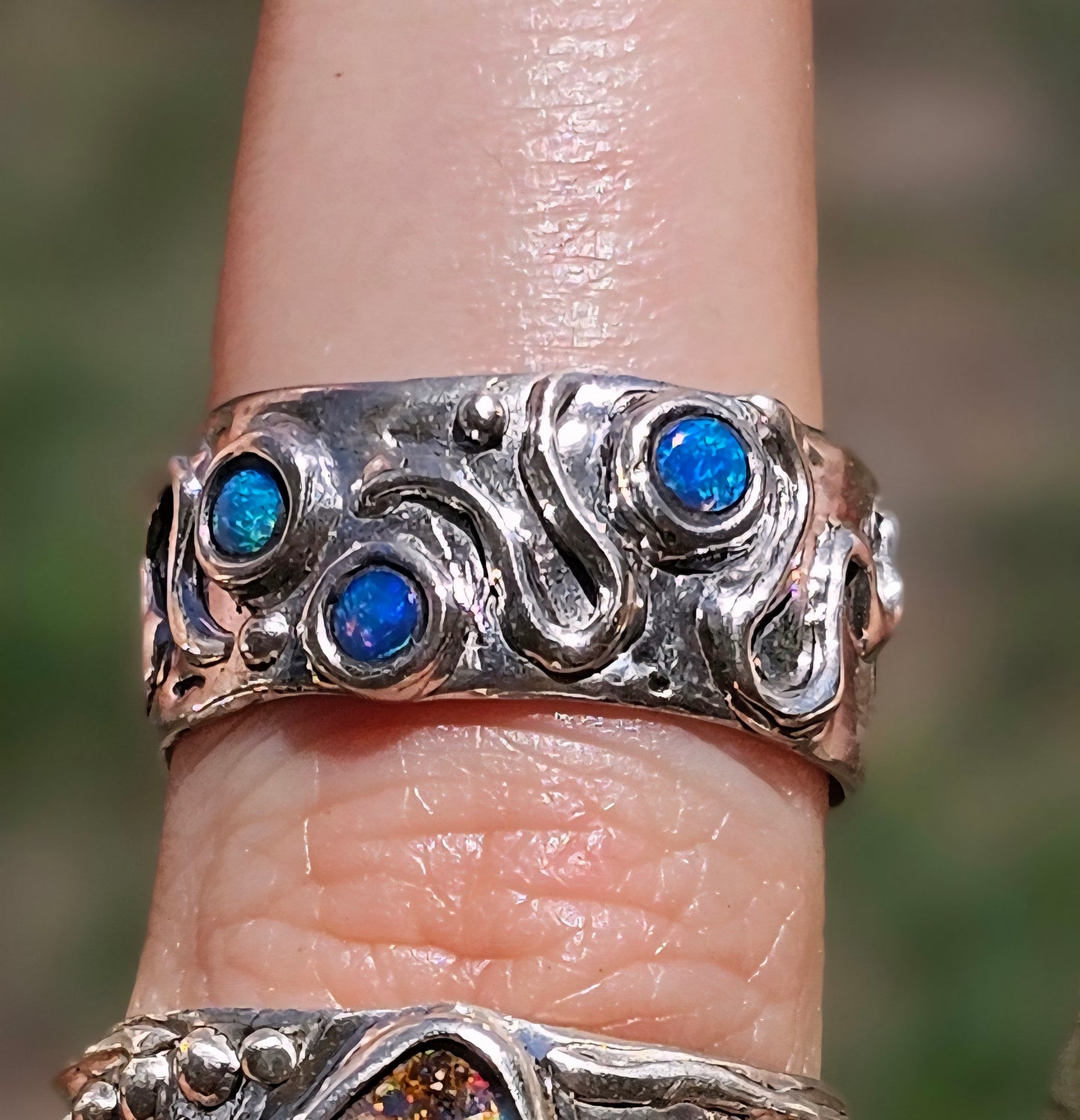 A celestial tide frozen in sterling silver. Siren’s Orbit features three vibrant blue opal cabochons set within swirling, wave-like engravings. The oxidized silver creates a deep-sea contrast, giving each opal the look of tiny galaxies caught beneath the surface. A bold, sculptural band for those who love the ocean’s mystery.