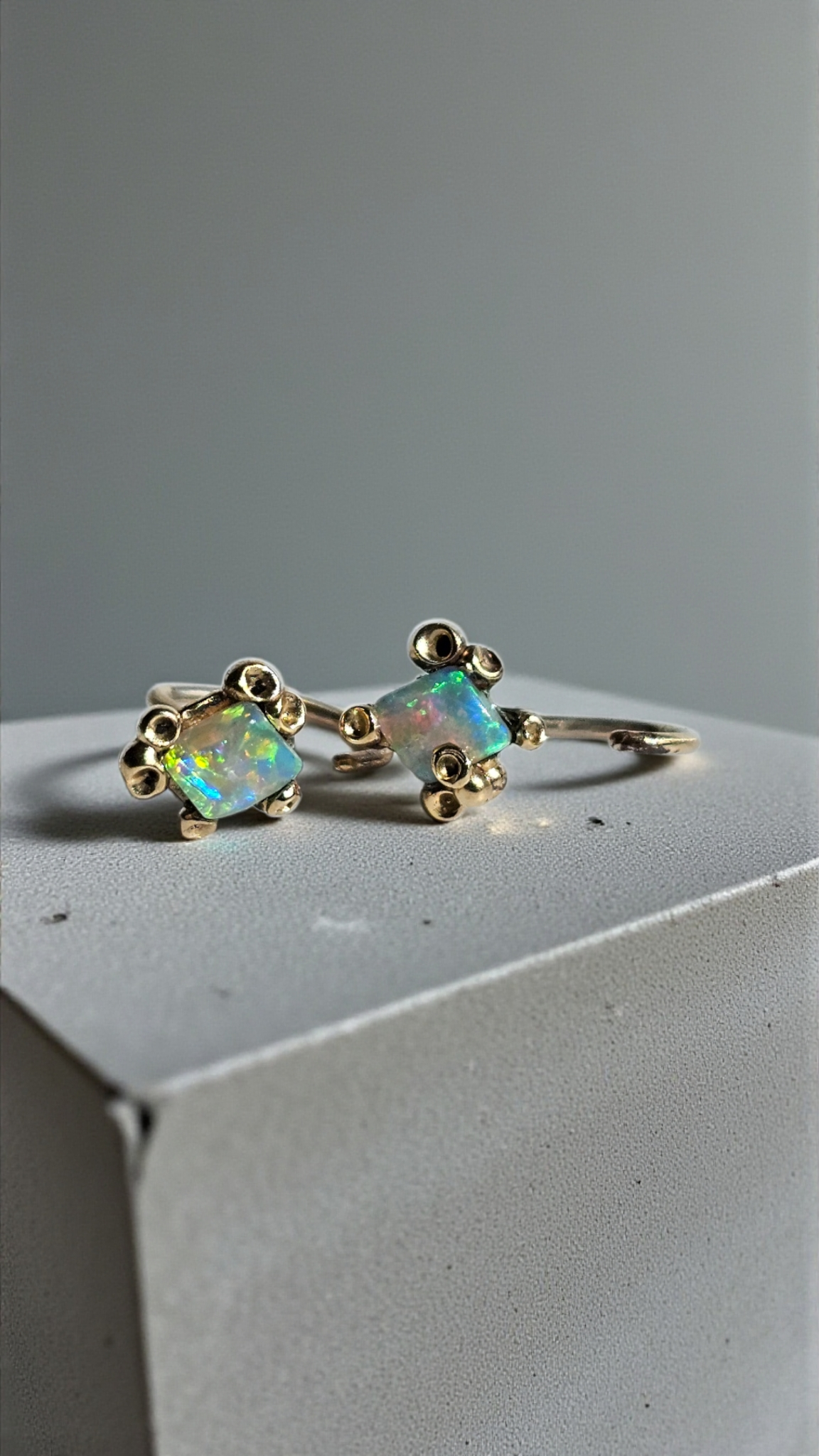 Warm, golden light meets ocean treasure. The Sunken Gold Huggies hug the ear in solid 9K yellow gold, holding pastel-toned Australian opals in rugged barnacle prongs. With a compact size and rich glow, they feel like tiny relics salvaged from a sunken ship — refined, ancient, and quietly luxurious.