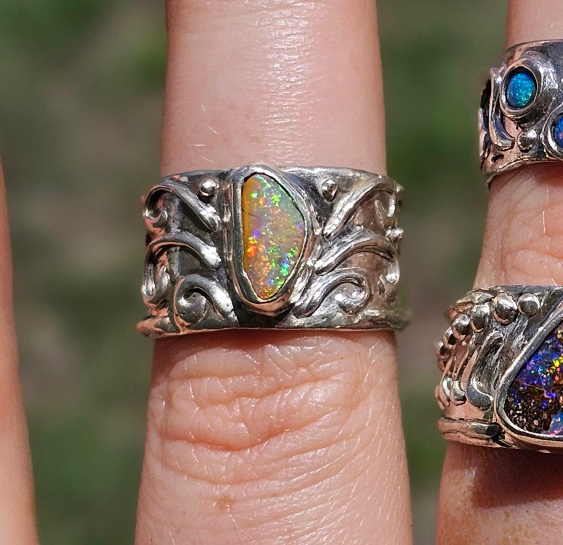 A burst of sunlight caught beneath the sea. Tidal Ember features a vibrant Australian opal ablaze with orange, gold and shifting green fire. Its natural shape is framed by carved wave-like textures that curl across a wide sterling silver band, echoing the pull of tides and the wild rhythm of the ocean.