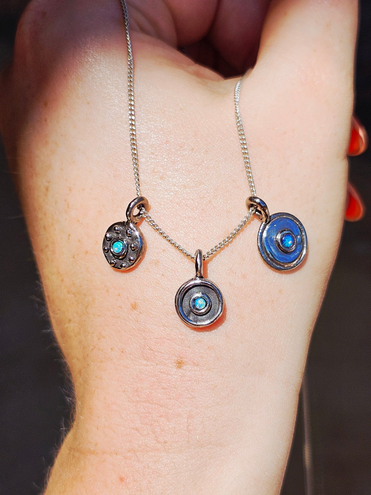 A solid 18k white gold pendant, hand-carved and showcasing a dazzling deep blue Australian opal. It’s like wearing the heart of the cosmos around your neck.